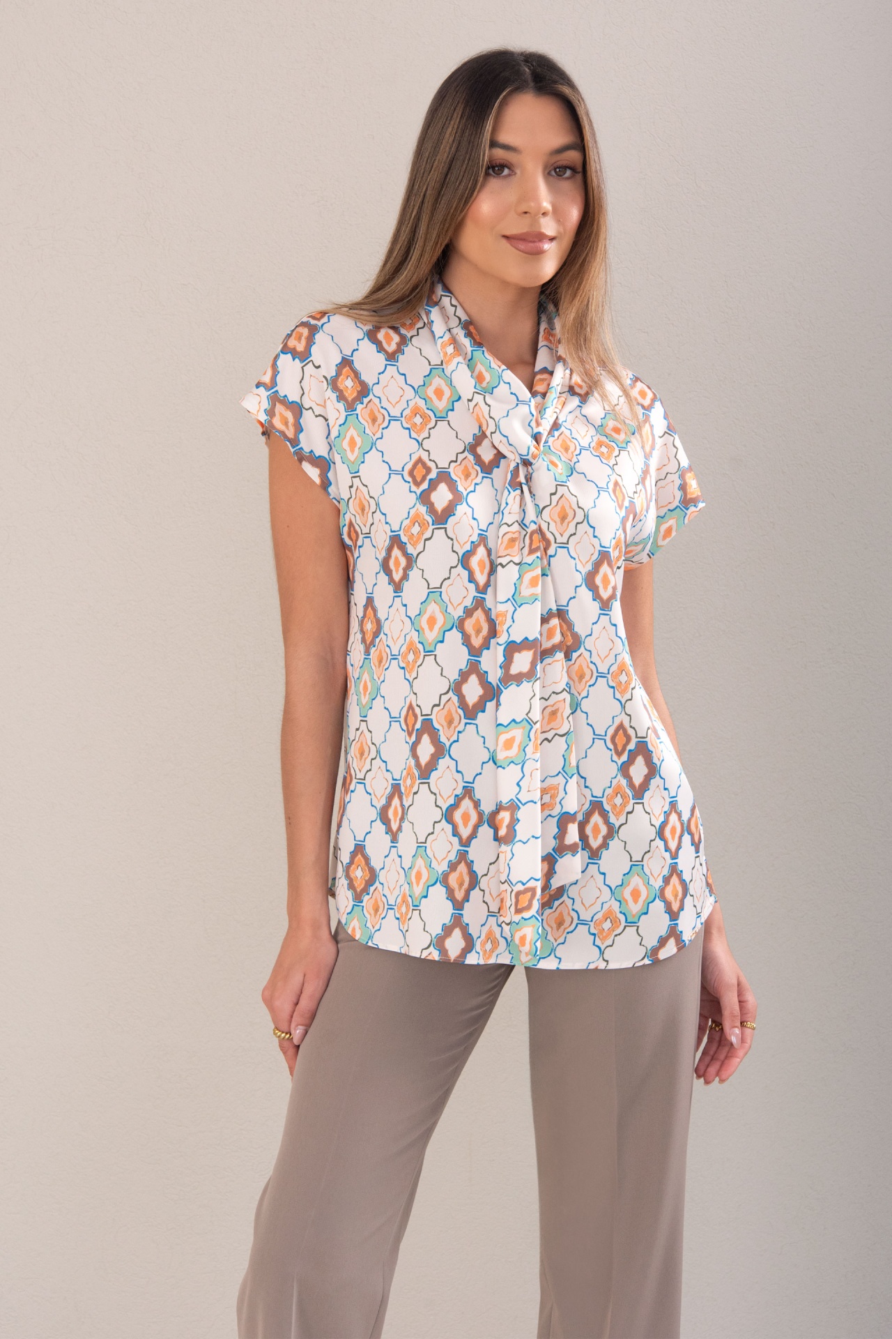 Blusa estampada de manga curta, um modelo sofisticado e cheio de personalidade. O detalhe no decote, com laçada em trespasse que cria um efeito semelhante a uma gravata, adiciona um toque elegante e moderno à peça. O caimento fluído garante conforto e leveza, tornando esta blusa ideal para composições versáteis, desde combinações mais formais a looks casuais com um toque refinado.