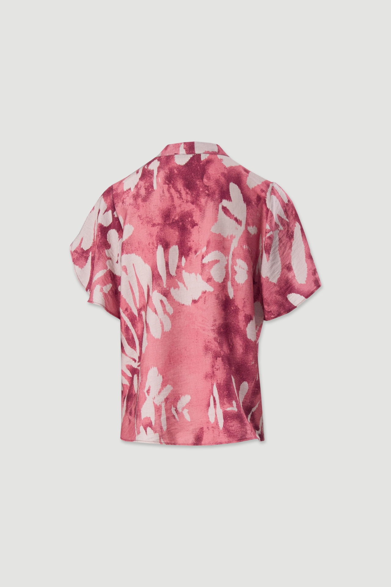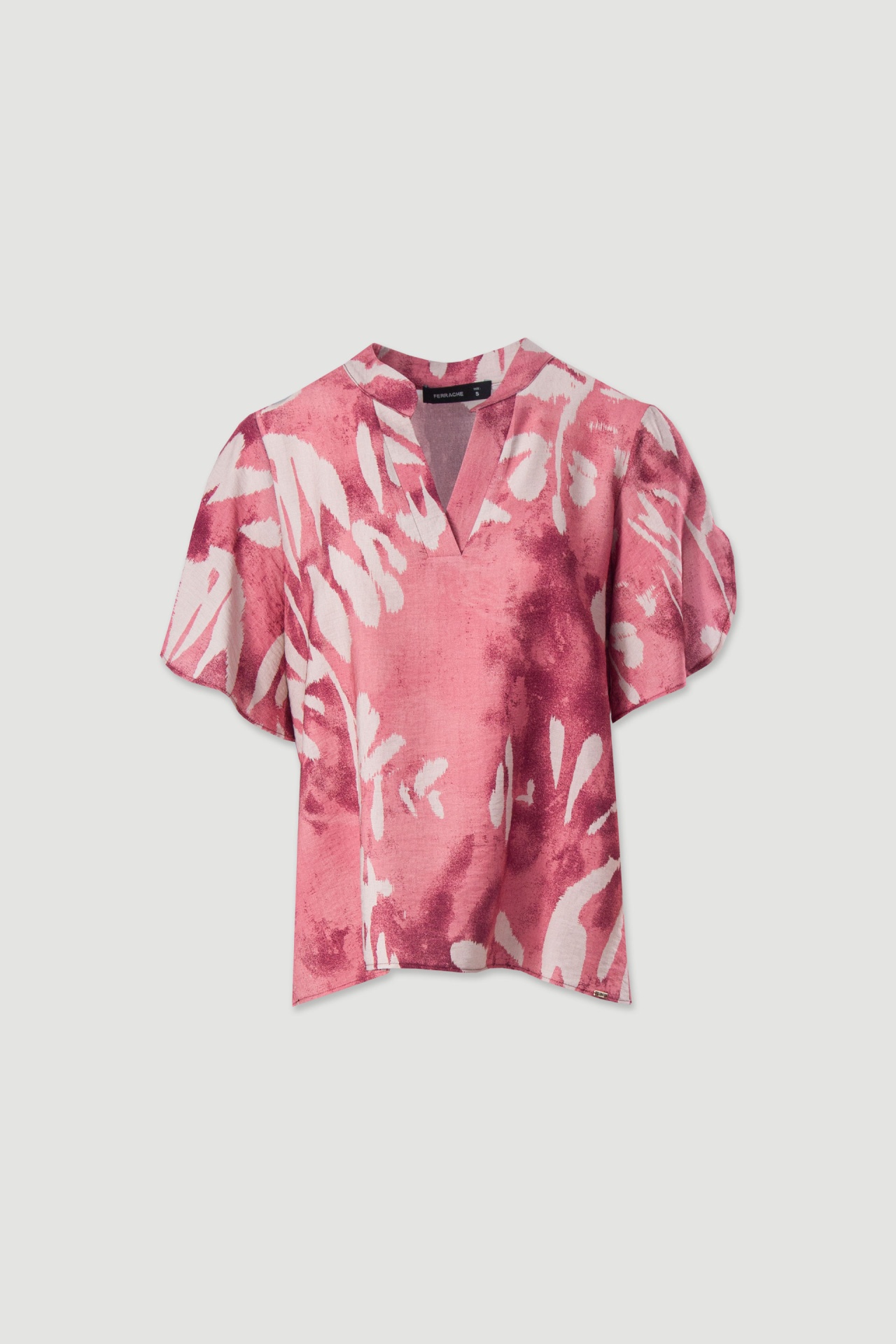 Blusa em tecido estampado com decote em V. A manga curta com racha lateral acrescenta movimento e um toque moderno ao design. Uma peça versátil e confortável, perfeita para coordenados descontraídos com um toque de cor e elegância.