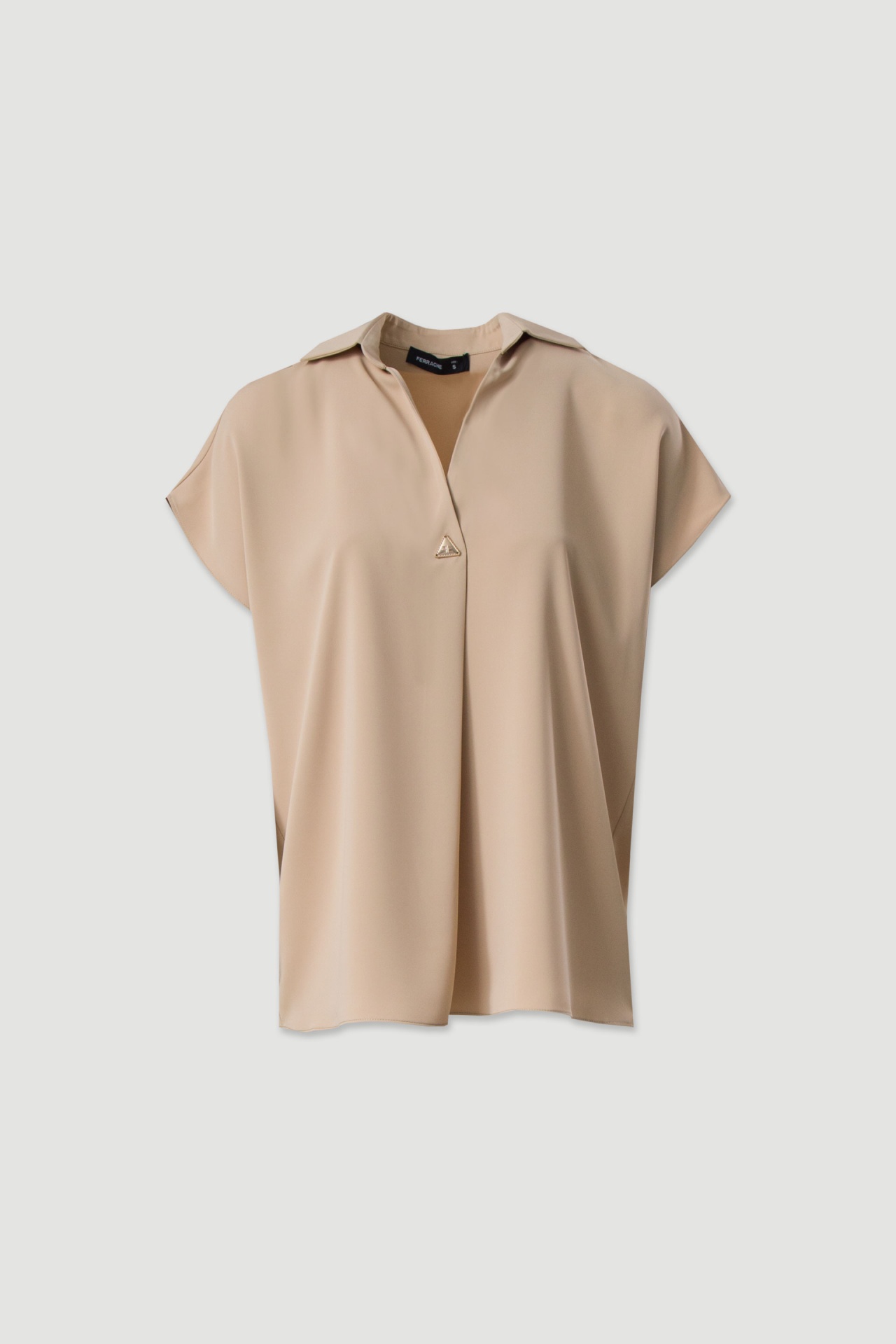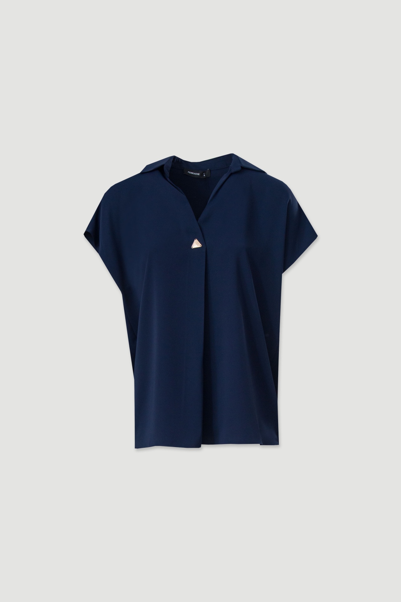 Blusa fluída de manga curta. Decote com colarinho, em bico com chapa personalizada na frente. Com uma prega frontal.