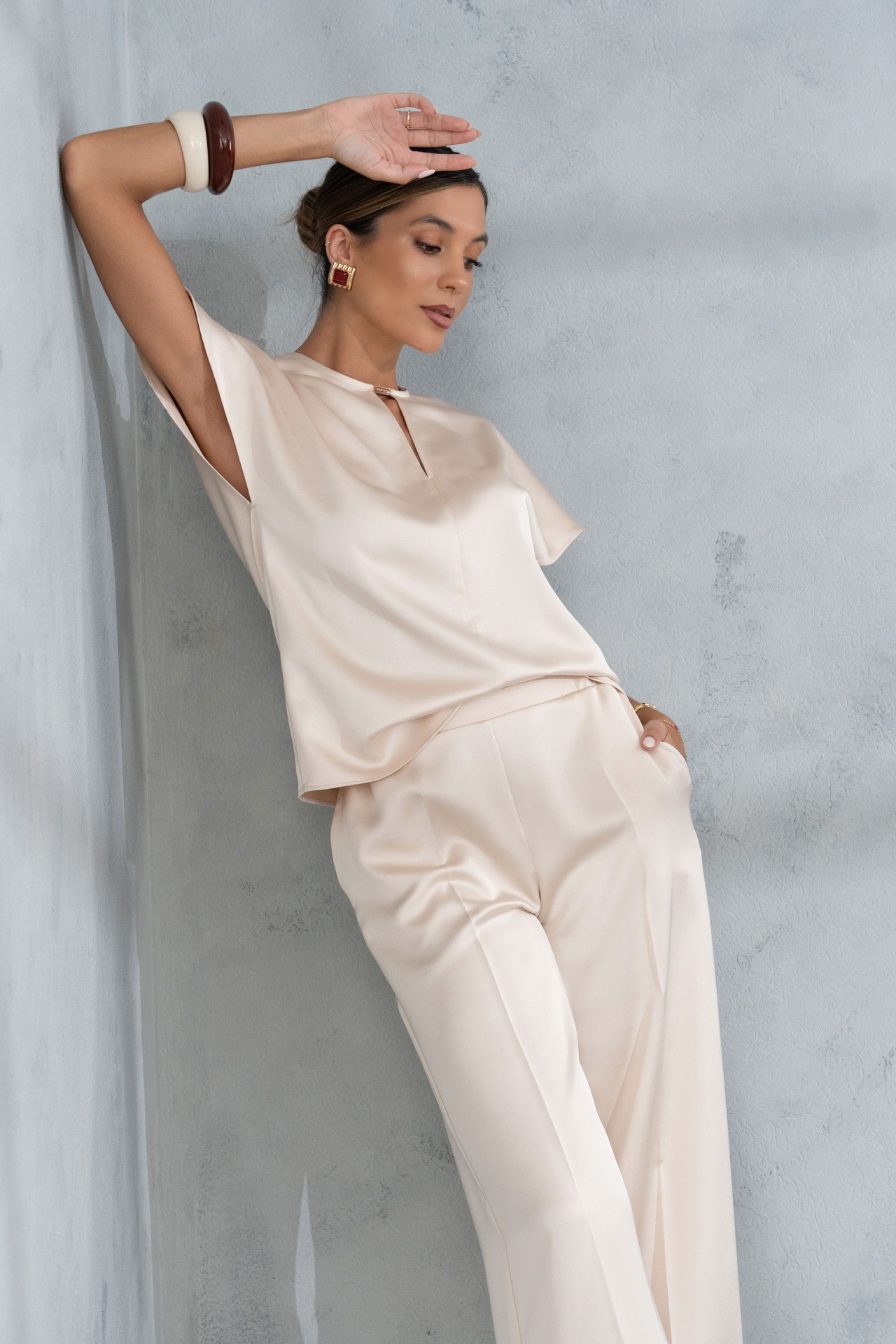 Blusa feminina em tecido acetinado com acabamento leve e toque sedoso. O modelo apresenta manga curta estilo capa e decote redondo com pequena abertura em V, criando um efeito subtil e elegante. O corte fluido garante conforto e liberdade de movimentos, enquanto o fecho de correr invisível nas costas assegura um ajuste limpo e discreto.