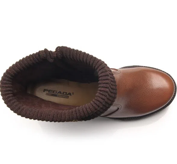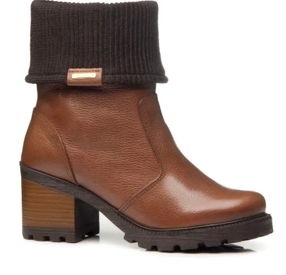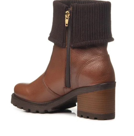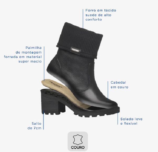 Bota feito de couro, matéria prima de alta qualidade, resistência e durabilidade. O forro é de tecido suede, muito macio e confortável. A palmilha também é feita com um material macio, proporcionando ainda mais conforto. Já o solado é leve e flexível, com um salto tratorado de 7 cm. O cano dessa bota tem aproximadamente 15 cm de altura e possui um zíper na parte interna que facilita o calce. Além disso possui um detalhe estilo meia na parte de cima do cano que faz toda a diferença na hora de compor o look.