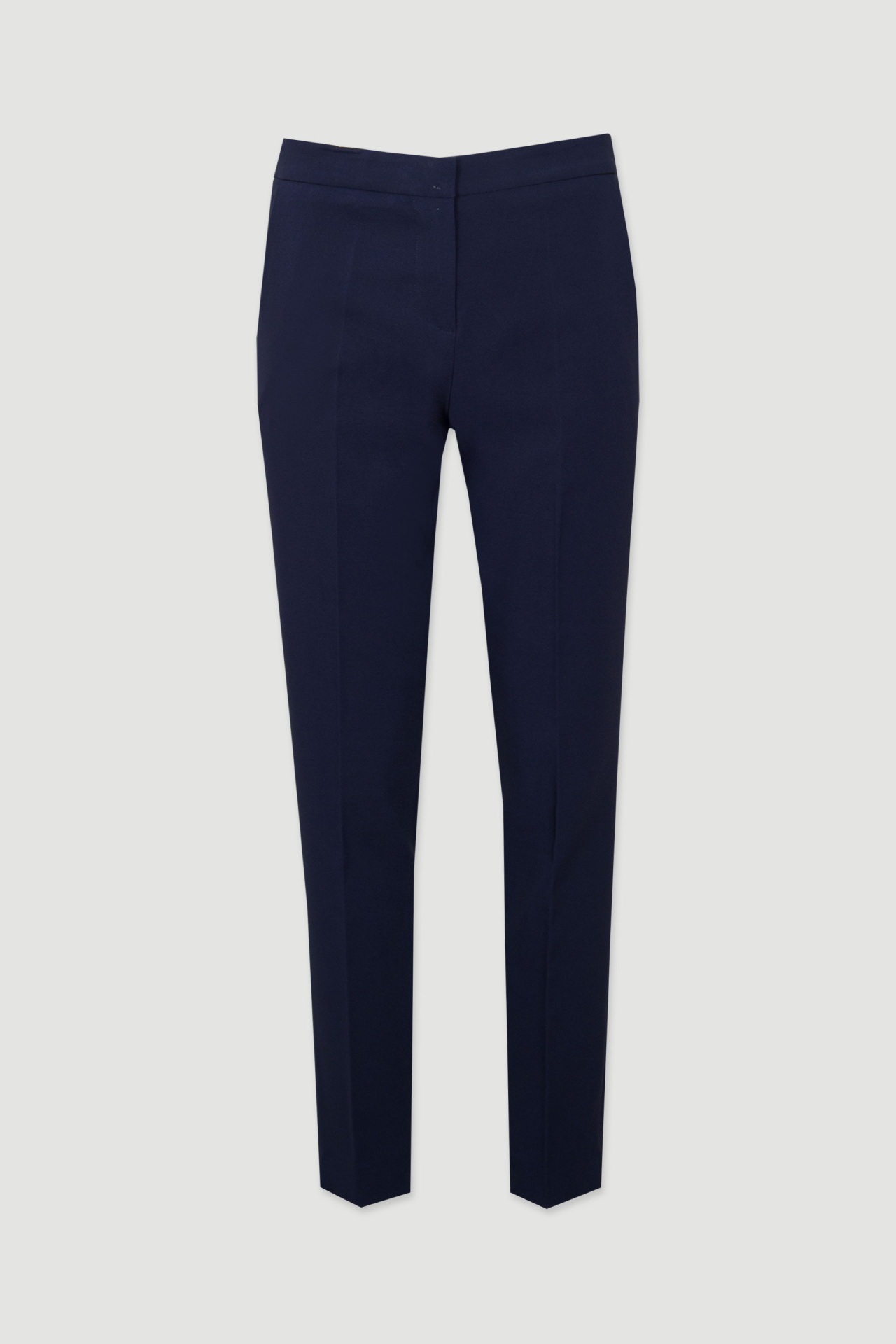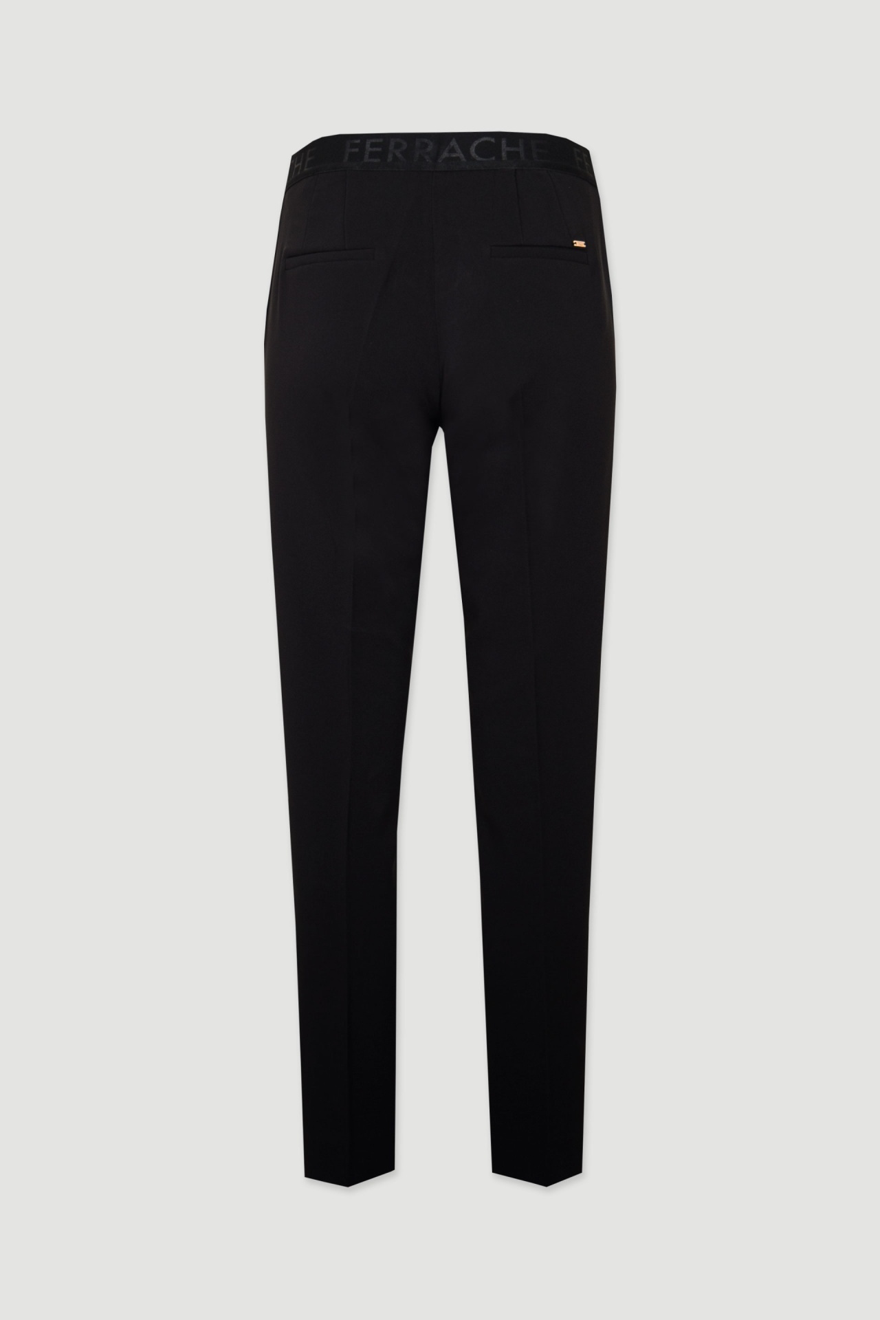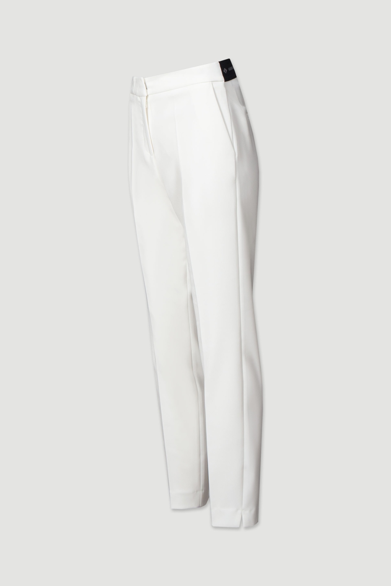 Calça de corte clássico com cintura subida. O detalhe de cinto elástico com logótipo na parte posterior acrescenta um toque moderno e discreto. Fecho frontal com gancho e botão interior para um ajuste confortável e seguro. Com bolsos laterais funcionais e bolso falso na parte posterior, é uma peça versátil para coordenados sofisticados e profissionais.