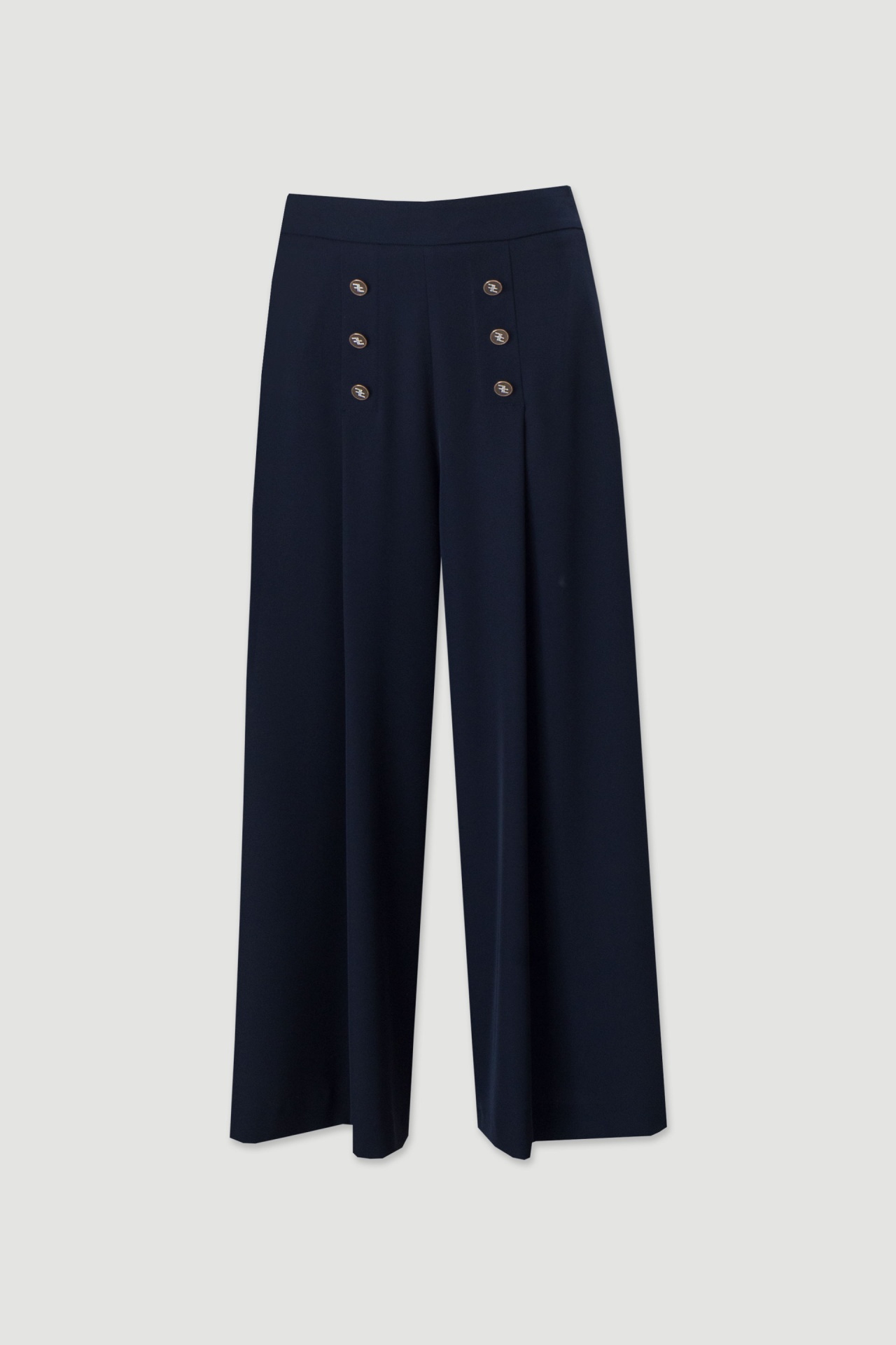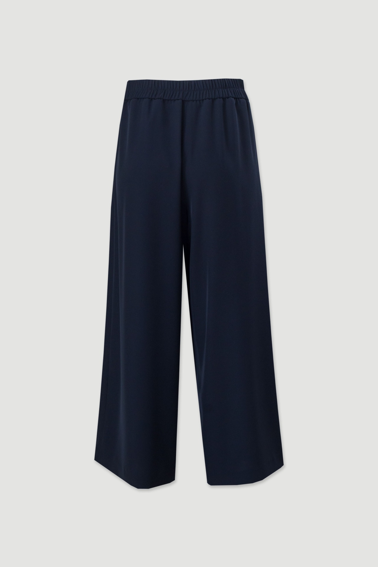 Calça culotte em tecido fluido, ideal para um look sofisticado e confortável. Com cintura subida e cinto elástico na parte posterior, oferece um ajuste perfeito e prático. O detalhe de prega na frente acrescenta estrutura ao corte, enquanto os botões frontais com aplicação de logo conferem um toque distinto e elegante. Os bolsos laterais reforçam a funcionalidade da peça, e o fecho de correr na lateral com botão interior assegura um acabamento discreto.