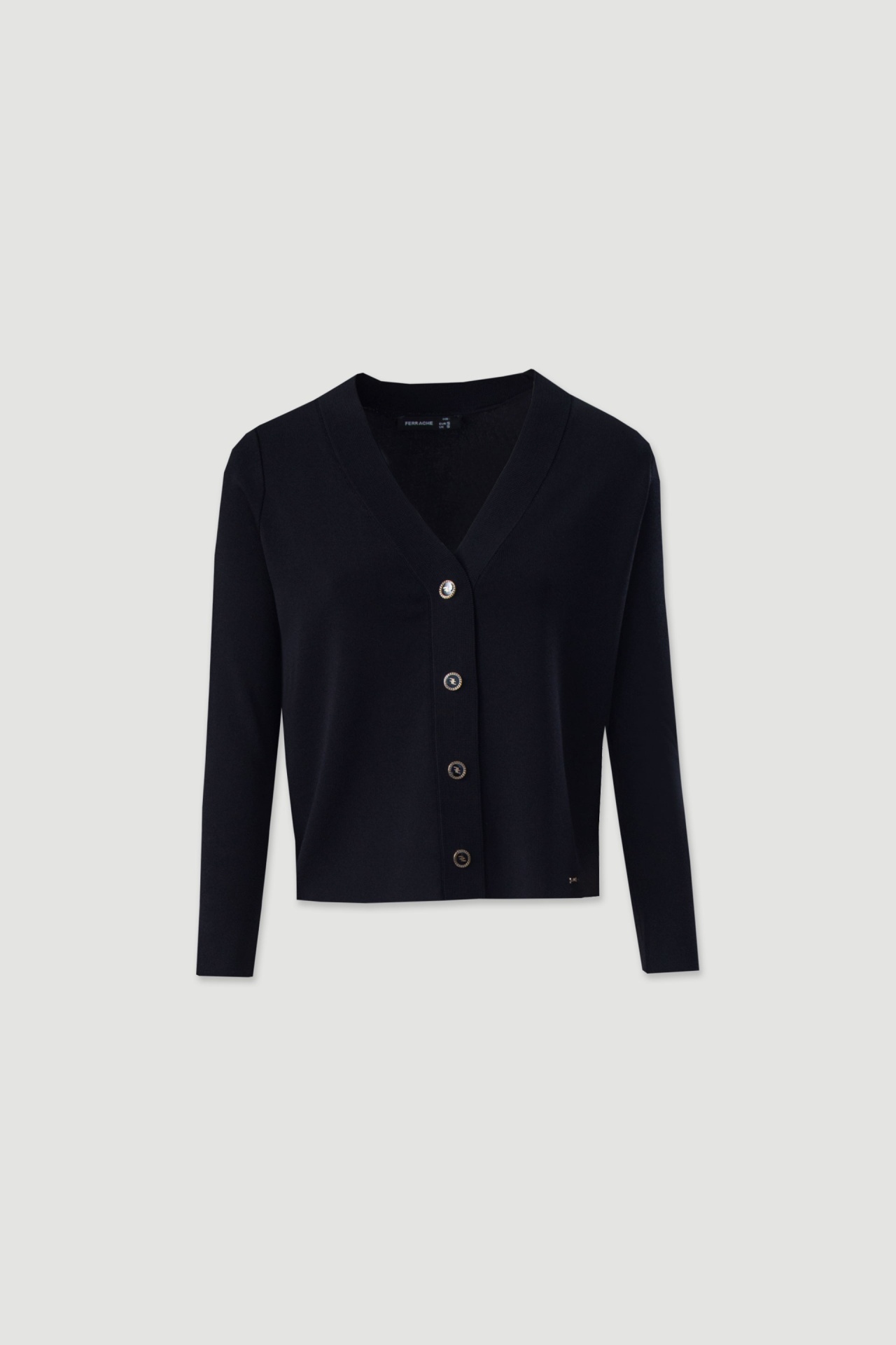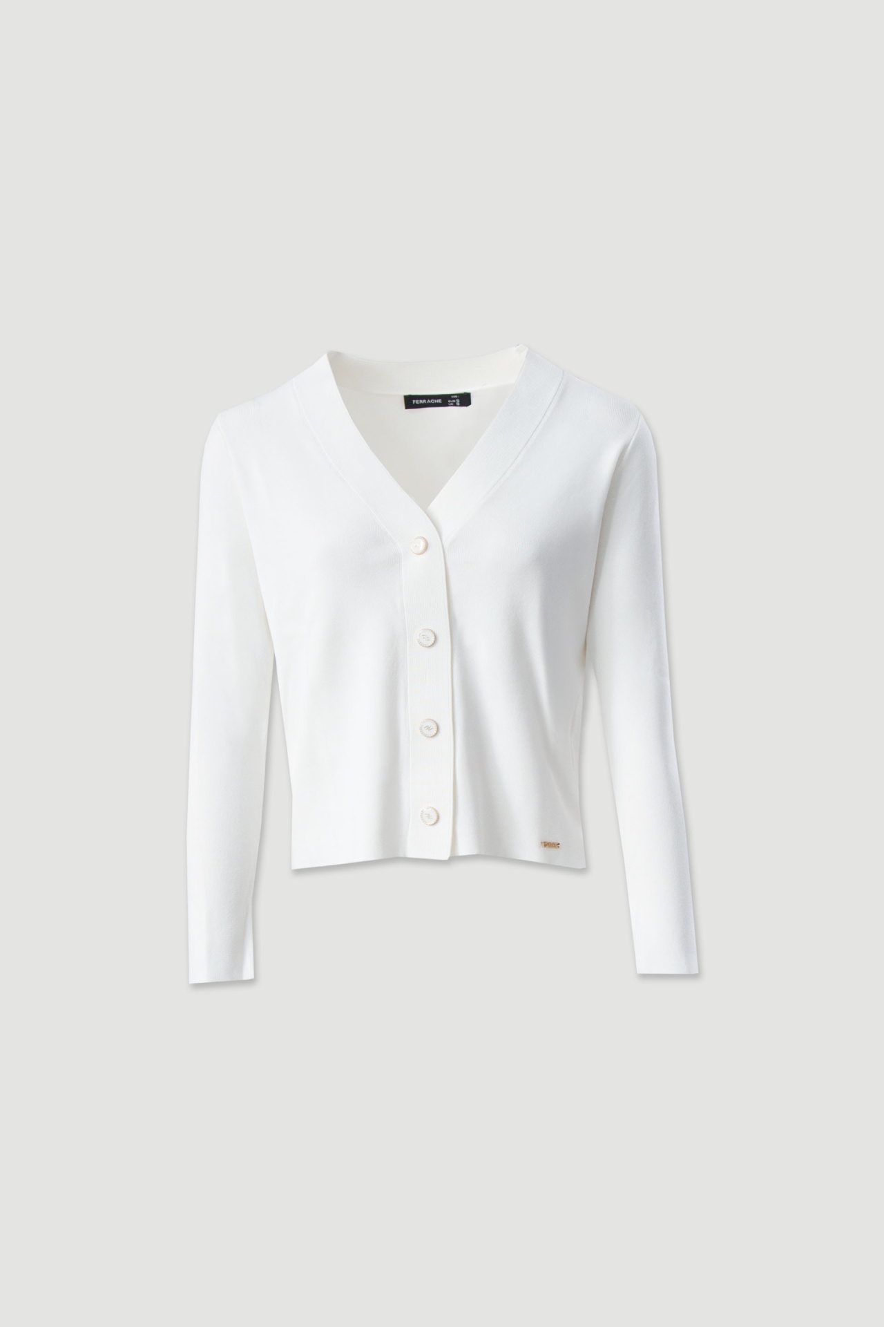 Casaco de malha de manga comprida. Com decote em bico e fecho frontal com botões personalizados na frente e nos punhos.