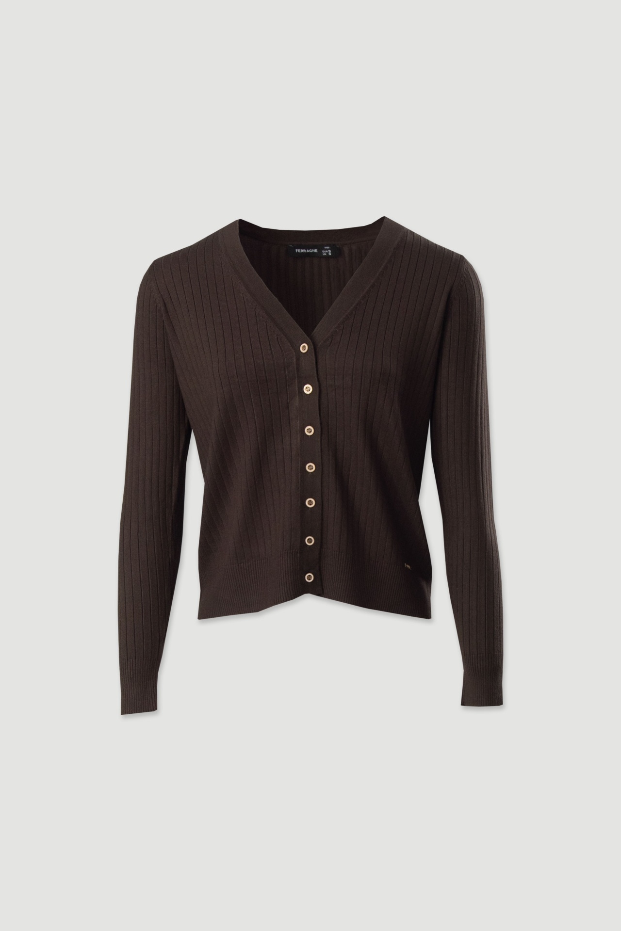 Casaco em malha canelada com design clássico e versátil. Apresenta decote em V profundo, fecho frontal com botões e corte ajustado que valoriza a silhueta. As mangas compridas e o acabamento em punho conferem estrutura, enquanto o detalhe da chapa metálica com o logo na barra acrescenta sofisticação discreta.