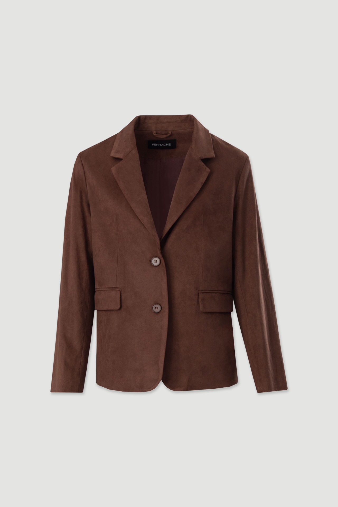Casaco de efeito camurça com design sofisticado e toque suave. Apresenta decote em bico, gola com lapela e fecho frontal com dois botões, que valorizam a silhueta. Os bolsos com aba acrescentam funcionalidade sem perder elegância. Com forro interior, é uma peça versátil e intemporal, ideal para complementar looks femininos com estilo e conforto.