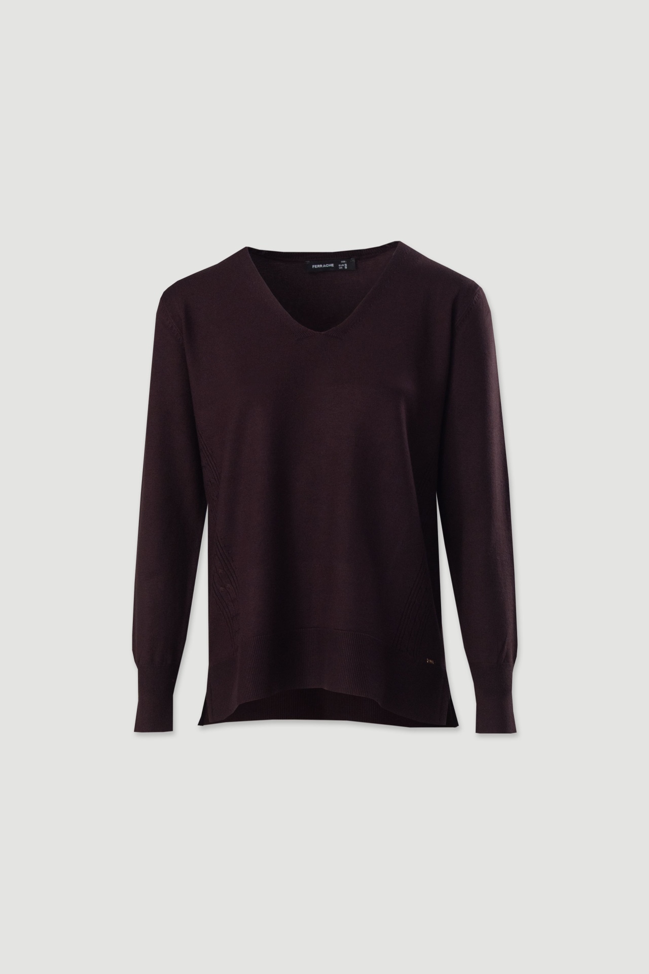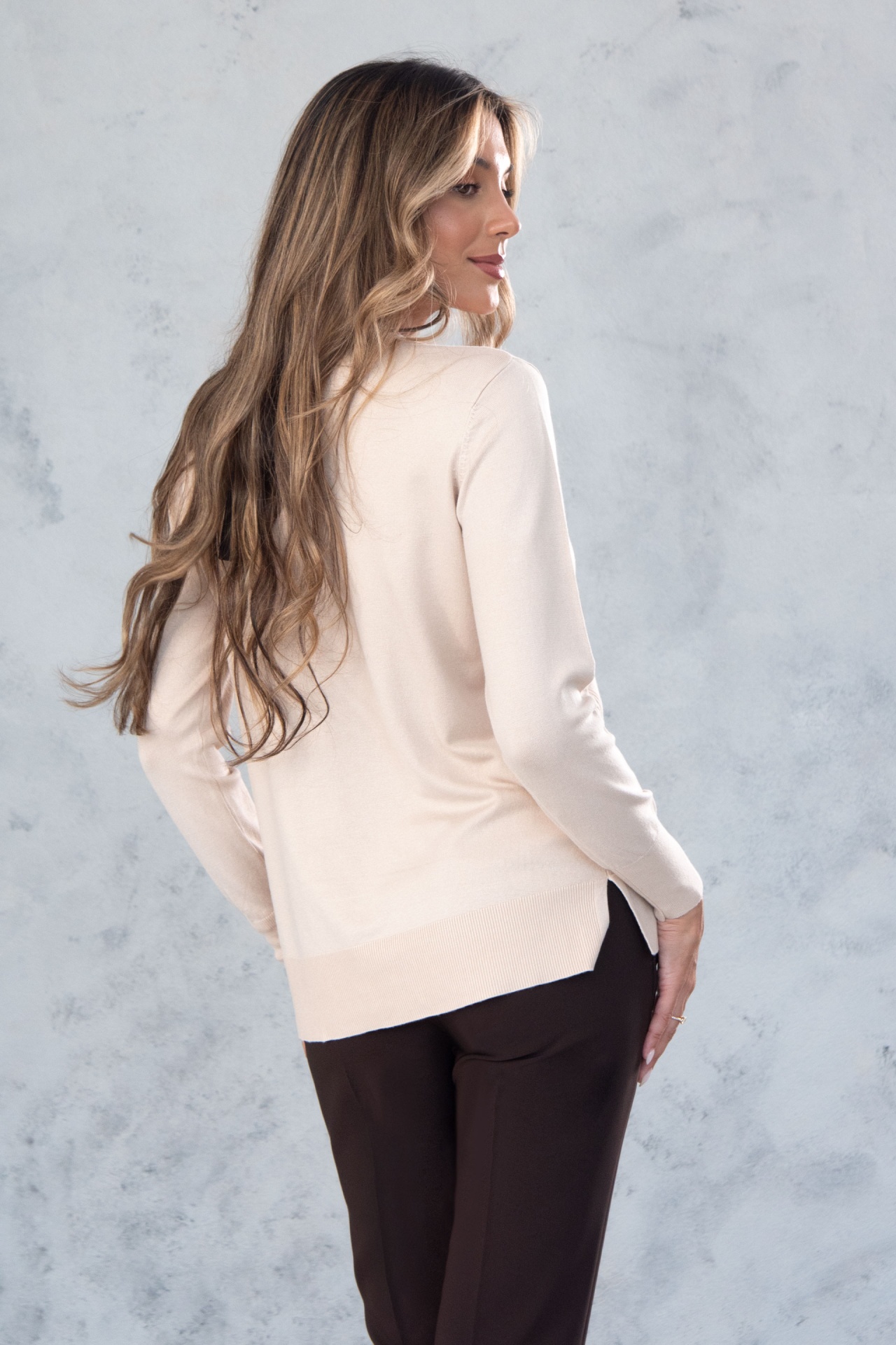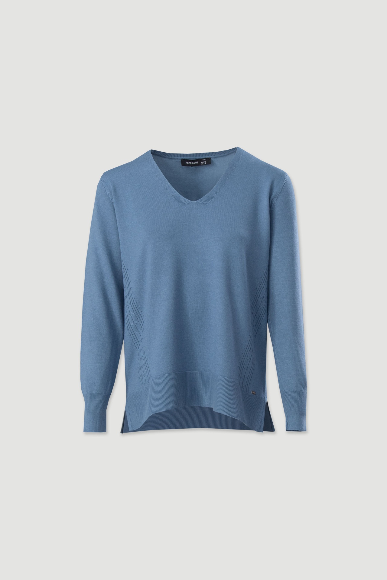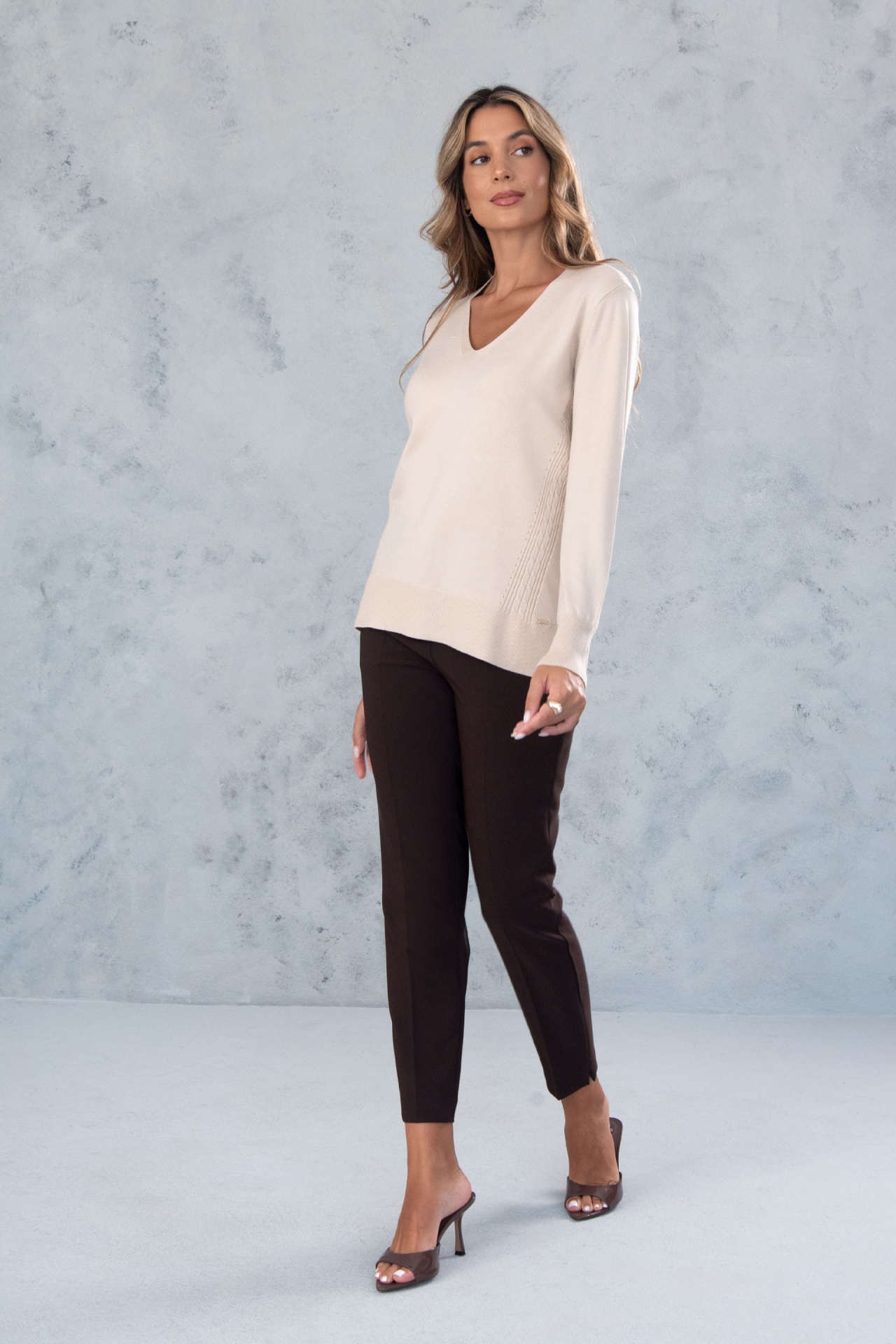 Túnica de malha fina com decote em V e corte ligeiramente alongado. Os detalhes em malha trabalhada nas laterais acrescentam sofisticação subtil, enquanto as aberturas laterais garantem conforto e fluidez ao movimento. Uma peça versátil e elegante, ideal para looks do dia a dia com um toque moderno.