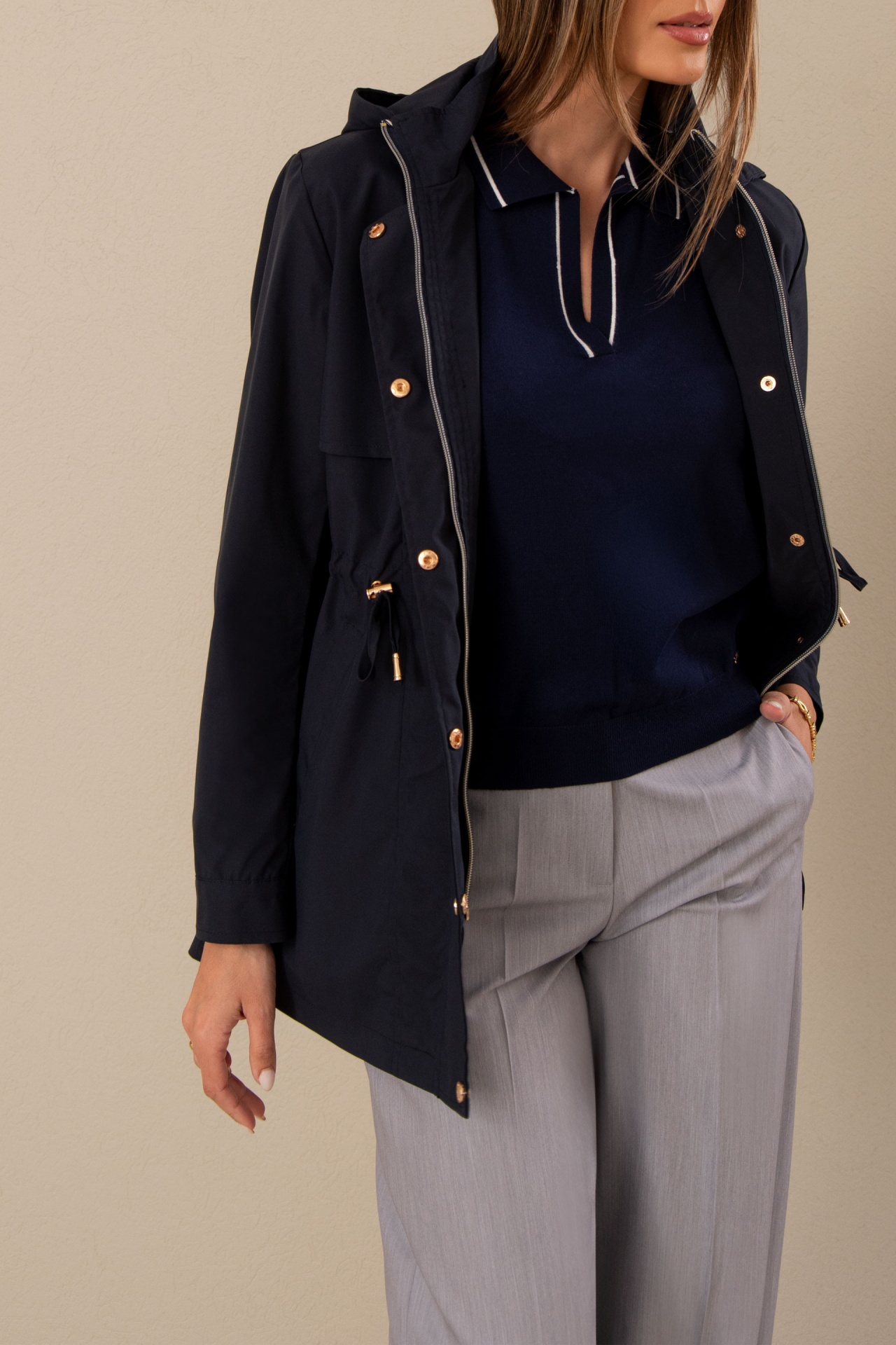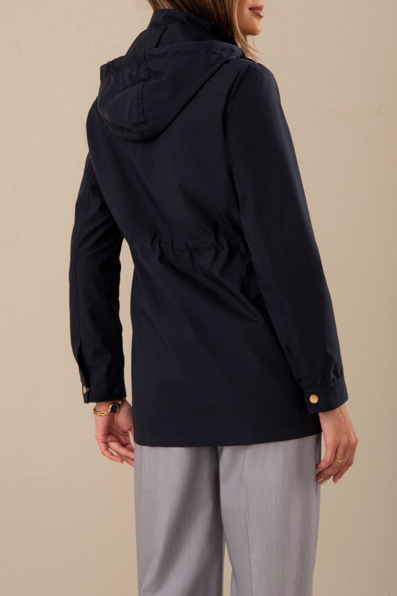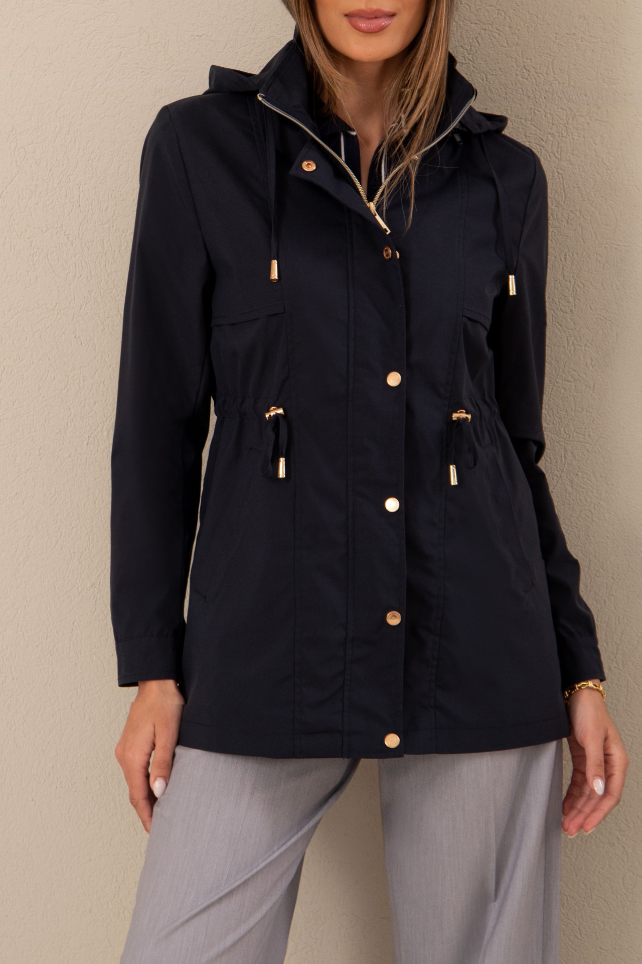 Parka com gola subida de capuz e cintura ajustável por cordão. Apresenta fecho de correr na frente e botões de pressão. Bolsos laterais e manga comprida com punho abotoado, combinando funcionalidade e estilo para enfrentar os dias frios com elegância. Com capuz removível por fecho. É forrado.