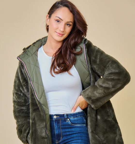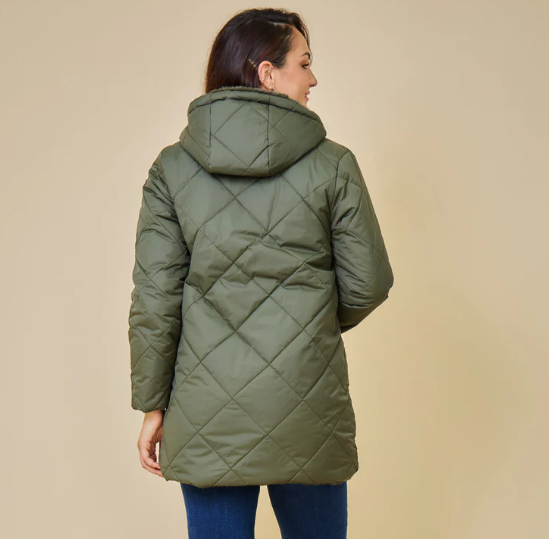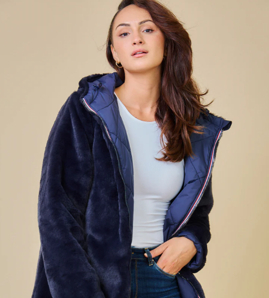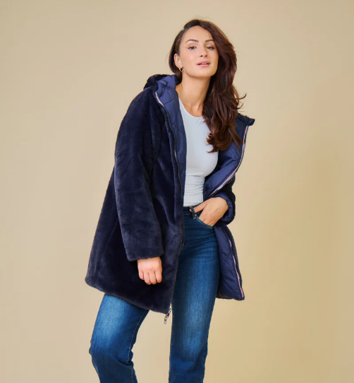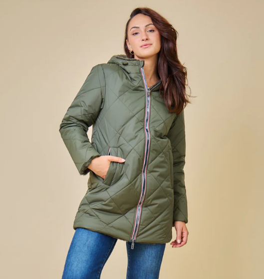 Parka comprida e reversível acolchoada com capuz ajustável.