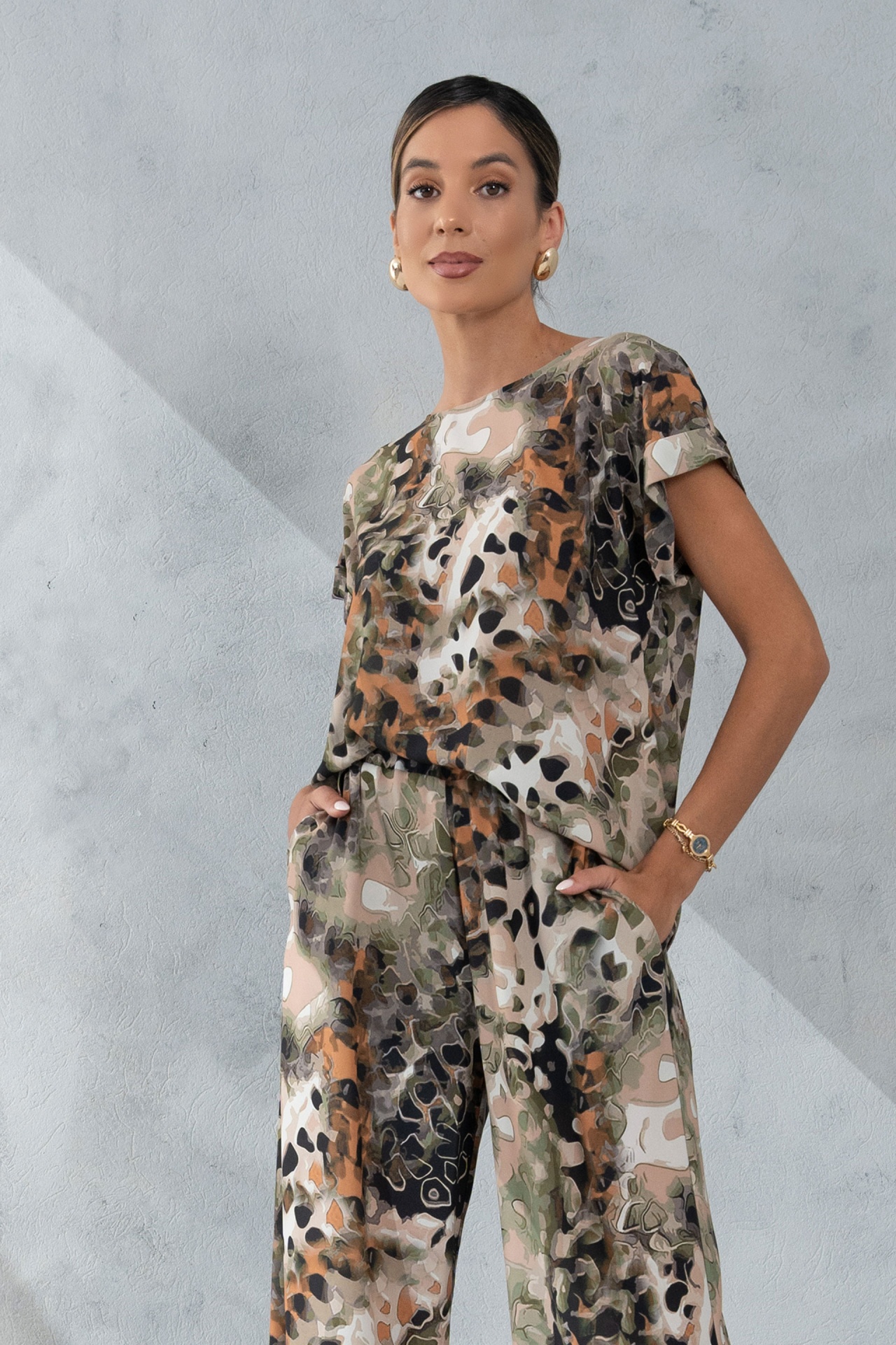 Túnica em tecido fluido estampado, com decote redondo que confere simplicidade e elegância ao design. A manga curta termina com uma discreta dobra, acrescentando um detalhe delicado e moderno.